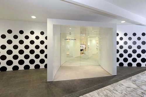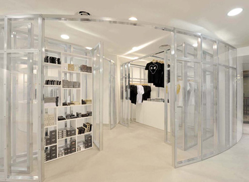 店鋪的裝修理念是由Rei Kawakubo川久保玲提出的,設(shè)計(jì)靈感來(lái)源于 “Construction Interrupted”,內(nèi)部包括許多單獨(dú)的空間,以便將不同系列的商品分隔開(kāi)來(lái)。此外,店鋪內(nèi)彎曲的墻面、木制或金屬構(gòu)架隨處可見(jiàn),給人以最舒心的購(gòu)物體驗(yàn)。