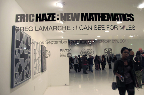 Eric Haze算是現(xiàn)今美國最知名的涂鴉藝術(shù)家和街頭文化推廣者了,前段時間這位涂鴉大師也曾光顧過北京知名的潮流店鋪MESS鋪并展示了特意為死飛活動創(chuàng)作的作品,令國內(nèi)的粉絲們大呼過癮。Eric Haze就是這樣一個為藝術(shù)而生的大師級人物,其最新的作品展覽主題為“New Mathematics”,各種單色的幾何圖形重疊組合在一起的視覺效果雖然有些讓人眼暈但是新奇的視覺效果很是過癮,強烈的透視效果給人留下深刻的印象,當(dāng)然還有其傳統(tǒng)風(fēng)格的作品也有了新的題材,從而給人耳目一新的感覺。