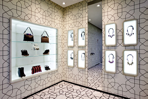 店鋪的裝潢風格鮮明地體現了2011秋冬系列的核心元素:從墻壁到地板,隨處可見八角形相扣的印花,上下兩層的空間則被作為視覺焦點的紅色樓梯隔開。