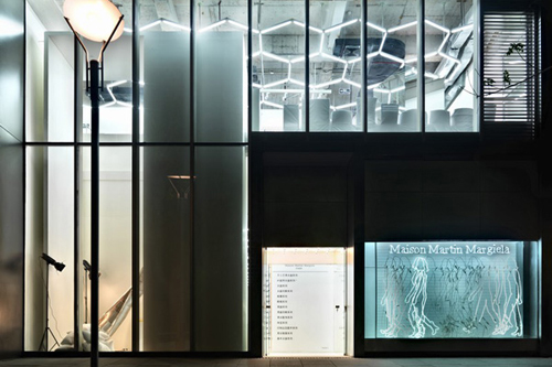這座兩層門店正對大街而設,店鋪面積達到540平方米。門店櫥窗使用了霓虹燈進行點綴,呈現出一個處于行走狀的女性形象以及“Maison Martin Margiela”的品牌名稱字樣。透過玻璃門面,顧客可以看到門店內部簡潔干凈的輪廓,其整體裝修沿用了這間時裝屋極具代表性的銀白色調。屋頂則彰顯了Maison Martin Margiela頗為珍視的極簡風格,表面覆蓋一層粗質水泥,并用六邊形熒光燈加以裝飾。
