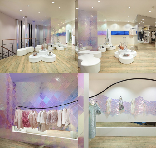 透明磨砂的人形模特,閃亮發光的陳列墻和玻璃管柱,以及層疊的鋁紙墻面裝飾,與陳列的本季海洋主題服裝相呼應。