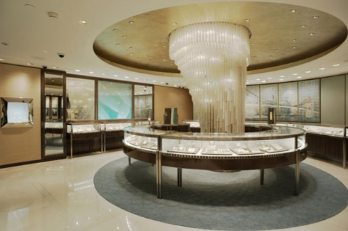 店內(nèi)的色彩主題以著名的蒂芙尼藍(lán)為基調(diào)。作為蒂芙尼的卓越品質(zhì)與非凡設(shè)計(jì)享譽(yù)全球的象征,這種獨(dú)一無二的色彩有效烘托出手工打褶織物與墻面裝飾物的別致效果。