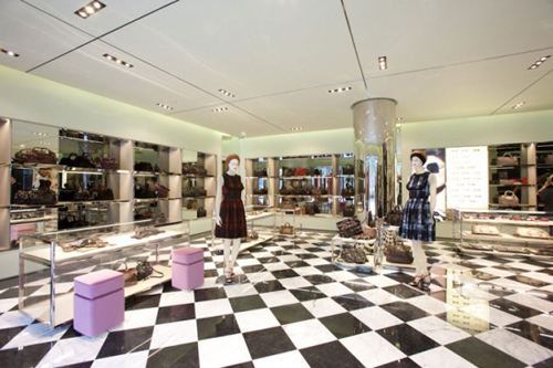 店鋪一層展售女性產品,陳列柜內部以淺象牙色Prada經典壓花牛皮、煙熏色鏡子進行裝飾,并設有丁香紫色天鵝絨沙發。
