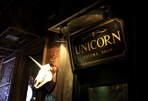 【中國鞋網-街頭搜店】UNICORN隱藏在田子坊的深深小巷一角,暗綠色的墻壁、深棕色的復古歐式家具,深木色的地板、璀璨的鹿角吊燈,更有各式詭異的動植物標本和骨骼以及實驗玻璃器皿、滴蠟的燭臺與陳舊的十字架……感覺是進入了一個陳舊的古代歐洲魔法師或落魄科學家的實驗室,回到了維多利亞魔幻時代初期,將UNICORN注重的“enigma shop”神秘主題氛圍完美呈現。各種精美的飾品高低錯落的陳列于各式骨骼與器皿之中,與裝修風格融為一體。