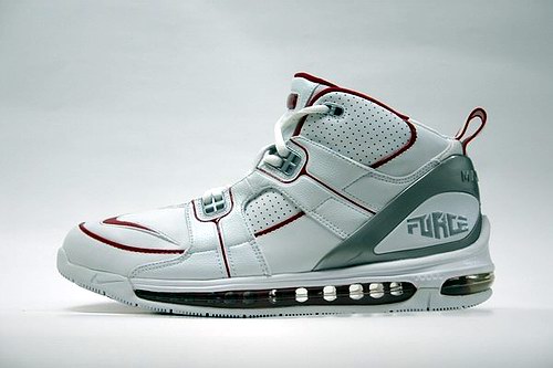 AIR TOTAL FORCE MAX想必是不少年輕人青睞的明星鞋款,因為他是去年爆紅的鳳凰城太陽隊Amare Studamire的代言款,配合游走禁區大塊肌肉型球員的身體素質和打球特性,大體積與大面積的氣墊可以有效減低這類FORCE型球員膝蓋的負擔,這款鞋的中底則是使用較韌的材質搭配高磅數氣墊,可以提供更優秀的避震性能,后腳跟運用一層TPU熱熔膠加上一層超細纖維及PU所制成的高級人造皮,形成安全的腳跟固定裝置,保護功能大升級,也不至于影響禁區發威的活動性表現。