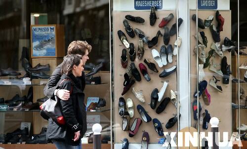 4月8日,一隊情侶經過法國巴黎街頭鞋店的櫥窗。自4月7日開始,歐盟對中國生產的鞋征收臨時性反傾銷稅,征收期為6個月。一部分法國市民和鞋商認為這一舉措將讓他們的利益受到損害。 新華社記者宋立東攝