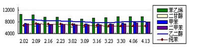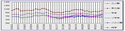 (1)、一周市場行情分析:A、純苯、甲苯、二甲苯:受資源供應減少和下游需求持續走強的帶動,本周華南、華東地區甲苯、二甲苯市場穩步上揚,其中華南二甲苯因貨奇缺升幅大,在250元/噸;甲苯升幅在100元/噸;華東甲苯、二甲苯均走高了50元/噸,市場價格分別為:7950華東-8600華南(二甲苯);7950華東-8100華南(甲苯);純苯市場價格因下游需求平淡而小幅回落了50元/噸,在6600華東-6650華南(元/噸、純苯)。苯乙烯:受下游PS需求回暖和外盤價格連續標高的影響,同時大部分貿易商、下游廠家接貨踴躍,尤其貿易商惜售心理增強,以及石化企業庫存低且上調價格,本周華南、華東地區市場行情繼續升溫,價格穩步上漲了100元/噸,華南、華東地區市場價格分別為:9850-990元/噸(華東)和10250-10300元噸(華南)。C、乙二醇、二乙二醇:受油價連日走高,外盤價格也相應上升的提點,以及資源供應緊張和下游需求增加的推波助瀾,尤其貿易商惜售心理增強的支撐,本周華東、華南地區乙二醇市場打破上周市場一度振蕩拉鋸的僵局,價格小幅上漲了100元/噸,在8150-8200(華南)和8250-8300元/噸(華東),銷售活躍。本周華東地區二乙二醇市場價格因下游需求回暖和外盤價格走高而上漲了100元/噸,在6500-6550元噸;華南地區市場因價格上漲過速,引發下游廠家和貿易商的強烈抵觸而回落了50元/噸,在6750-6800元/噸。