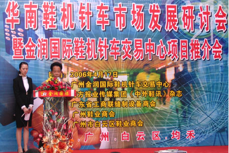 “華南鞋機針車市場發展研討會暨金潤國際項目推介會”由“廣州金潤國際鞋機針車交易中心”、南方報業傳媒集團《中外鞋訊》雜志聯合主辦。來自中國內地及港臺地區的知名鞋機針車廠商,鞋類行業機構領導、專家,以及各大新聞媒體的代表出席了會議,代表們就中國鞋機市場的發展現狀和趨勢,發展模式和技術創新,以及今后市場的方向等,發表了各自的看法和意見。