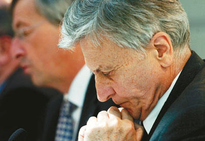 4月7日,在奧地利首都維也納,歐洲中央銀行行長特里謝(右)出席新聞發布會。當日,歐盟國家經濟和財政部長會議在維也納舉行。會議主要議題為:在全球化背景下,歐盟國家如何應對亞洲國家的經濟競爭。