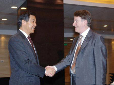 在談到WTO多哈回合談判時,薄熙來表示,目前談判進入關鍵階段,歐盟在農業等議題上應采取更加靈活的立場。作為發展中成員,中方已為推動談判取得進展做出了積極努力,歐盟應理解和支持中方在發展中成員和新成員地位問題上的關切。曼德爾森介紹了歐方對談判形勢的看法和立場,并表示歐盟注意到中方對發展中成員和新成員地位的關注,愿與中方在談判中加強協調與合作。