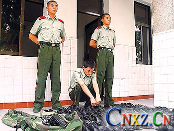 一個冒充軍人賣軍鞋的男子,經群眾舉報,被深圳布吉分站官兵抓獲,當場繳獲34雙型號為“三五一五”的黑色皮鞋,價值1360元。