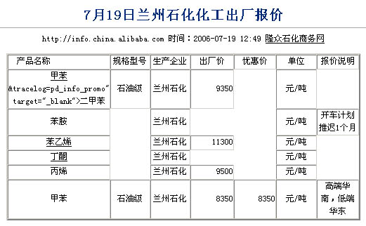 7月19日蘭州石化化工出廠報價