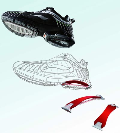 Arch部件是減震功能實現的核心部件,具有相當大的形變能力。在腳后跟著地過程中能夠通過適當的形變緩沖地面的沖擊。在選擇材料時,經過近千次測試和調整,最終使用兩種新材料的混合體,既保證一定的彈性又保證適當的材料剛性。根據不同人體的體重和運動項目可以進行適當的材料調整。