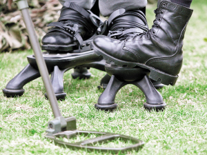 這種新型“排雷靴”底部多了幾個高跟,可更好地起到保護作用。2006年9月14日,在哥倫比亞波哥大,一名哥倫比亞士兵穿著特制的“排雷鞋”進行排雷。英國軍事專家一直在訓練哥倫比亞的軍事人員清除地雷的技術。由于連年游擊隊混戰,哥倫比亞遍地地雷。據反雷組織的調查,僅在去年一年,就有1100名哥倫比亞人死于這些地雷。
