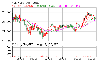 花旗亦發表報告,將裕元目標價由26.2元調高至27.4元,及維持「買入」投資評級,主要是認為徵收反傾銷稅對裕元影響輕微,對集團總收入僅6%影響;07年度其皮鞋付運量增長料6%,較今年6.8%微跌;由於成本下降,其毛利率在去年第3季已由低點回升,料裕元今年下半年的經營利潤率,可受惠較高的平均單價及較低的研發成本而改善;又預期,該集團今年內地運動鞋銷售額可達3.13億美元,增幅為85%;裕元冀08年北京奧運舉行前,其自營店可由現時600間增至1,000間。