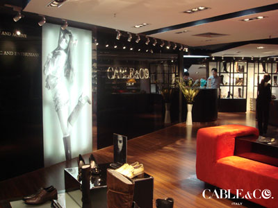 2006年10月10日CABLE&Co.首家旗艦店進駐廣州世貿,以“時尚表情十足的經典黑白空間”與消費者見面。CABLE&Co.旗艦店,整個空間以“黑白灰”為基調,令每對高舉復古中性旗幟,傳承一貫的優雅細膩,以奢華低調的黑色玻璃為引導購物的動線,別致的現代歐式壁面陳列柜錯落兩側,弓形交織的雙色沙發可見創意者的完美主義情節,營造出智慧與浪漫、個性不羈、愜意優雅的格調、及舒適生活的現代感受。