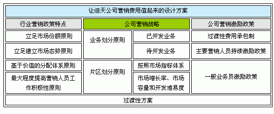 我們將該公司業務劃分為現有業務和未開發業務,總體營銷費用在這兩者的分配上有一個比例的調整:對公司現有業務這一塊,因為公司已經可以進行控制,就可以采用過渡性費用包干方法,提高業務員的費用利用自主性。對未開發業務,公司在總體營銷費用上有所側重,從某種程度上我們是傾向于公司形成明年的市場體系。