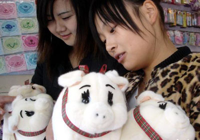 11月11日,在蘇州學士街的一家工藝飾品店,顧客在選購造型別致的家用保暖“豬頭鞋”。時下雖然距離農歷豬年還有一段時間,但在蘇州市場上各種與豬相關的工藝品已受到消費者的青睞。