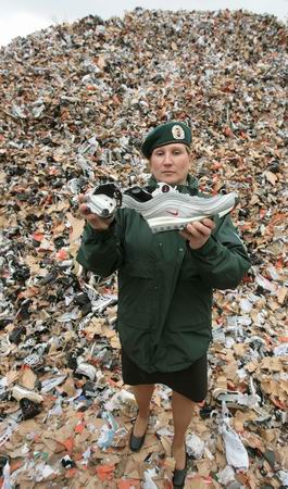 11月14日,一名德國海關工作人員在漢堡港展示被銷毀的假冒耐克運動鞋。漢堡海關表示,自2006年8月底以來,他們已經截獲了大約117個集裝箱超過200萬件的假冒名牌產品,價值達3.83億歐元(約合人民幣38.6億元)。