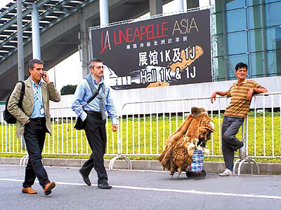 昨日上午九時,世界著名的意大利琳瑯沛麗亞洲皮革展在廣州國際會議中心隆重舉行,吸引了來自歐洲的一百多家優秀企業參展,中國以及亞洲的一些優秀企業也參加了這次展覽。開展當天,記者看到場外有人擺起地攤向參展來賓叫賣皮革。