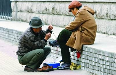 場景:一位老人蹲在街邊,為老伴兒穿上新鞋。