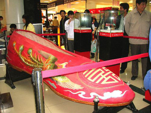 2006年11月,在江蘇昆山舉行的鞋文化節(jié)上,世界上最大的繡花婚鞋現(xiàn)身昆山商廈,讓市民連連稱奇贊嘆。據(jù)主辦方介紹,該繡鞋以中國傳統(tǒng)婚俗鞋花“龍鳳呈祥”為主題,全長2.8米、寬0.87米、高0.71米,重63公斤,鞋內(nèi)可寬敞地躺臥兩三個人。此鞋運(yùn)用60多種真絲色線,10多種針法在紅色緞面上繡出栩栩如生的金龍彩鳳、祥云等圖案。