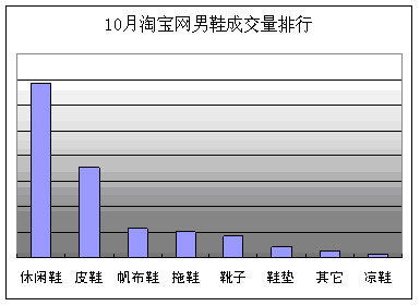 10月,淘寶網(wǎng)上成交最多的男鞋仍然是休閑鞋,皮鞋、帆布鞋緊隨其后,但成交量較休閑鞋均有較大差距。