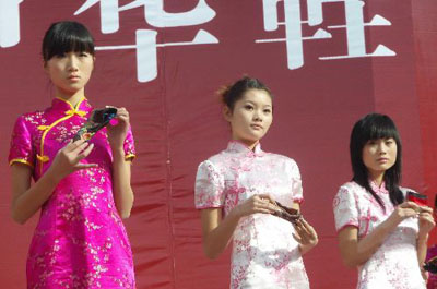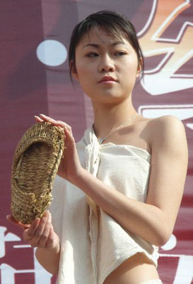 模特正在展示中國古代的“三寸金蓮”(小腳鞋)