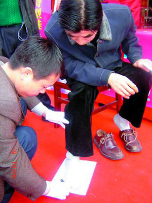 分別為5位讀者量腳后,百幸“特型鞋工作室”技師確認,他們的腳均屬“特型”,其中,還有“異型”。在火速與江蘇廠方取得聯系后,百幸工作人員表示,特大、特小號腳鞋碼均將在10天內可以到貨。而對異型腳,雖有一定難度,但會精心進行技術研究和處理,按腳型制出一雙合腳的皮鞋來,時間將略長,在20天左右。百幸鞋業董事長侯躍表示,很樂意為全長沙城“特別”的腳提供特別的鞋,能與《長沙晚報》共同承擔這樣一份社會責任,百幸覺得非常自豪。侯躍還表示,對于殘疾等一些行動不便的人群,百幸可免費提供上門量足服務,市民可撥打電話5124761報名聯系。此外,對于確認為特困的“特型腳”人群,百幸還將考慮免費贈鞋。