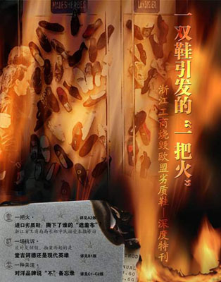 1987年杭州武林門的那把火,10萬多雙溫州劣質皮鞋在滾滾濃煙中化為灰燼,這把火燒出了溫州人知恥而后勇的決心;1999年還是武林門,溫州人自己放了一把火,把那些偽造溫州鞋的商人燒得焦頭爛額,燒出了溫州人進軍高檔品牌鞋的信心;那么,這次火燒歐盟劣質皮鞋,對于溫州鞋企,對于溫州人意味著什么呢?
