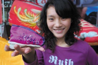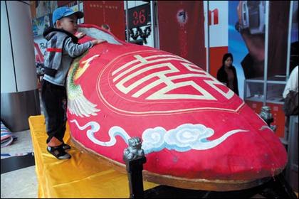 最小的鞋要屬中國古代婦女穿的“三寸金蓮”鞋,最大的一只繡花鞋采用中國傳統婚俗鞋花“龍鳳呈祥”為主題,在紅色緞面上運用60多種真絲色線,10多種針法傳神地銹刺出栩栩如生的“金龍彩鳳”等圖案,鞋型挺逼真,整體曲線圓潤飽滿。一名工作人員告訴記者,這只繡花鞋是目前世界上最大的繡花婚鞋,于2004年被世界吉尼斯紀錄收編。