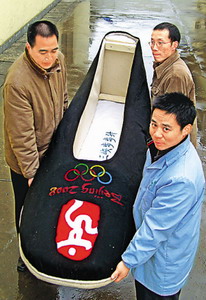 1月15日,湖北宜昌市枝江步步升手工養生布鞋公司的工人在展示一只長約2米的“中國風”2008北京奧運手工布鞋。該鞋單只重49.5公斤,鞋底408層,將無償捐獻給北京奧組委。