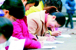 拿到超市招聘報名表格的求職者正在填表
