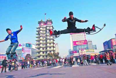 鄭州青年腳穿50厘米高鐵鞋 猶如袋鼠跳