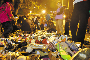 昨天晚上,路過解放北路象崗山社區門口的鐘先生被眼前的情景嚇了一跳,在社區門口的小路和人行道上,堆滿了數千只各式各樣的女鞋,上百女性市民正在瘋狂地“淘寶”(見右圖,莊小龍攝)。鐘先生一打聽才知道,這些鞋子是從昨天下午開始,被人陸續傾倒在此的。
