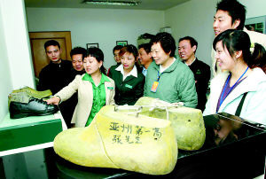 而最讓消費(fèi)者感興趣的還是夢(mèng)柯達(dá)的特碼鞋工作室。在這里,存放著數(shù)百雙千奇百怪的特碼鞋鞋楦,最小的一雙鞋子,不足30碼,而最大的,就是大到60碼的超級(jí)大鞋,其中還有一大一小的鞋子。
