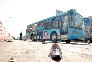 記者趕到現(xiàn)場(chǎng)后看到,公交車站旁的瀝青路面上留下了四五雙皮鞋和運(yùn)動(dòng)鞋,遭遇瀝青“陷阱”的乘客已在他人的幫助下擺脫困境。由于路面上的瀝青太黏,他們中的大多數(shù)只得舍棄鞋子,然后光腳站在路邊打電話給親朋好友讓他們送鞋解圍。其中一名婦女由于離家較遠(yuǎn),只好光著腳走到附近超市買鞋救急。