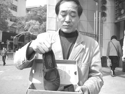 柯先生告訴記者,這雙皮鞋是他花兩百多元為女兒買的,“本來買鞋是為了讓女兒高興的,沒想到會這樣,連襪子都被染成了黑色。”柯先生氣憤地說道。可當柯先生把那雙脫色的皮鞋拿到專賣店要求更換一雙時,對方卻拒絕了柯先生的要求。無奈之下,柯先生投訴到本報。