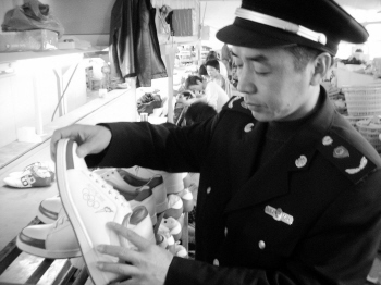 近日,永嘉縣工商局甌北分局在浦一工業區的一家鞋廠發現,二樓生產車間的鞋架上赫然擺放著一排排印著奧運標志的白色紅邊休閑鞋。在皮鞋的外側印著藍色的“BeiJing 2008”字樣,在文字下方印著橘紅色奧運五環標志,右邊還有橘紅色的奧運火炬圖形。這家鞋廠的倉庫里,五六名工人忙著包裝印有奧運標志的皮鞋,四周堆放著一摞摞已包裝完畢的成品。
