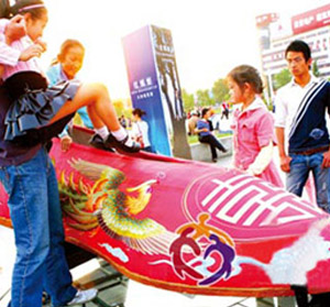 5月6日,濟(jì)南泉城廣場(chǎng)上,孩子們爭(zhēng)相爬到一個(gè)2.8米長的大繡花鞋里拍照留念。當(dāng)日,一只特大“三寸金蓮”亮相中國鞋文化展,吸引了眾多市民的目光。