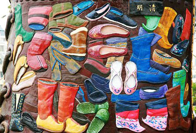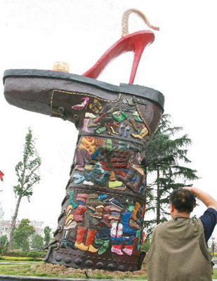 5月16日拍攝的大型玻璃鋼雕塑《鞋博會》局部。近日,一座名為《鞋博會》的大型彩色玻璃鋼雕塑在蘇州相城國際服裝城廣場亮相。在這座高10余米的雕塑上,“裝飾”有歷代男女鞋、靴圖案200余款。