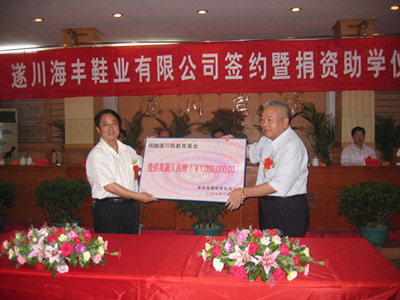 在簽約儀式上,廣東海豐鞋業有限公司還向遂川縣教育基金會捐資100萬元,用于資助貧困學生。
