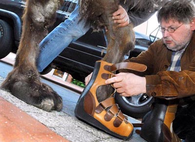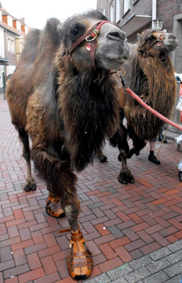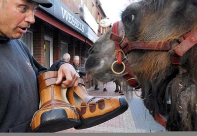 5月17日,德國弗雷登,當地鞋匠Peter Wessels給一頭名為駱駝“Goliath”穿上特制的鞋