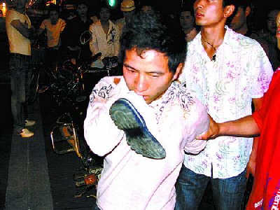 5月18日晚7時45分左右,記者經過浙江省溫嶺市太平街道體育場路與萬泉西路交界處紅綠燈處時,只見馬路上圍著不少人,似乎是出了車禍,跑過去一看,地上還倒著一輛摩托車,幾個人好像為一個人包扎著什么,走近一看,原來是抓到了一個外地小偷。