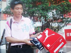 昨日10時許,李先生說,5月20日,他在一家商場的“PUMA”(彪馬)運動服飾專柜,花699元買了一雙“彪馬”賽車休閑鞋。鞋子買回去后穿了不到兩天,就出現開膠現象。23日下午,他撥打了海南12315投訴電話。不久,大英工商所的執法人員和李先生來到了“PUMA”(彪馬)運動服飾專柜調查。28日那天他看到了商家提供的產品“檢驗報告”,但是報告標明產品生產日期卻是“2007年12月30日”。