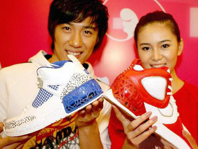 5月31日,模特在北京舉行的“第二屆中國運(yùn)動裝設(shè)計大賽啟動儀式”上展示具有北京奧運(yùn)元素的“鳥巢”和“水立方”的喬丹運(yùn)動鞋。當(dāng)日,“第二屆中國運(yùn)動裝設(shè)計大賽啟動儀式”在北京舉行。該大賽將于2007年11月在中國國際時裝周上舉行。