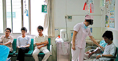 下午3時,在醫院6名出現中毒癥狀的工人正在急診室內輸液。“應該不是食物中毒,我們都沒有一起吃過飯!币灰仔展と朔Q,他們6人四五天前就出現胸悶、惡心、嘔吐和腹痛癥狀,并曾被送到白云區一家小醫院治療!暗珟滋於疾灰姾棉D,今早才把我們轉到第十二人民醫院”。