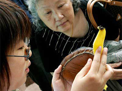 “香蕉皮擦皮鞋”的活動新穎有趣,令市民非常好奇。同濟大學的大學生志愿者們向市民解釋了其中的奧妙。原來,香蕉皮里含有的“單寧”能和皮鞋上的污垢中和,既能除垢又能拋光。