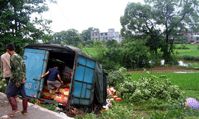 據贛D31660零擔貨車的溫姓司機介紹,當時,他看到贛B02615大貨車迎面而來,有些搖晃,車子也占道,兩車交會時對方的駕駛室與他的車廂相掛。贛B02615大貨車撞倒4棵大樹后,沖出105國道翻下水田。溫師傅車上裝的皮鞋等物品,也受沖擊散落于地。隨后趕來的五六十個村民,哄搶散落在地上的皮鞋。直到交警來到現場后,局面才得以控制。