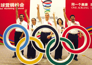 5名奧康集團海外員工在奧運五環邊發表《夢想宣言》。昨天,奧康集團以別具風格的方式宣告啟動新全球營銷戰略。